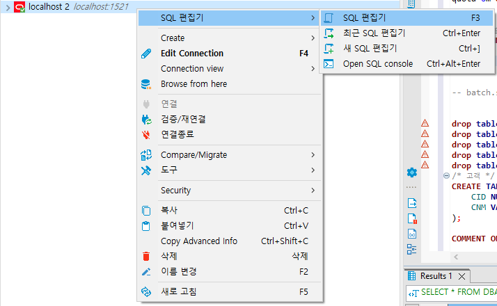연결된 오라클에서 우클릭을 하시고 SQL 편집기 > SQL 편집기 혹은 새 SQL 편집기를 누르시면 오른쪽에 Script 창이 생깁니다.