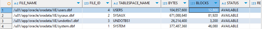 FILE_NAME 이라고 적혀있는 부분을 보시면 현재 존재하는 테이블스페이스의 경로와 이름이 나와있습니다.