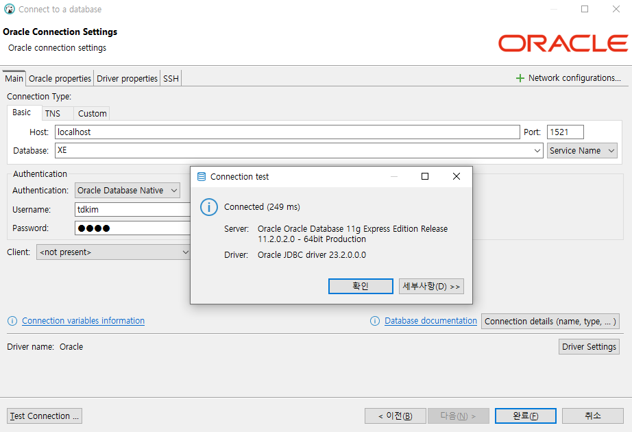 그리고 좌측 하단에 있는 Test Connection 버튼을 눌러서 위와 같이 나오면
