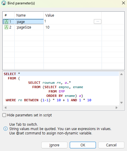 페이징 처리에 대해서 조금 설명하면서 바인딩 변수에 대해 설명하겠습니다.