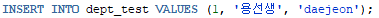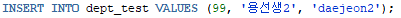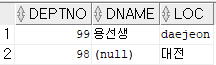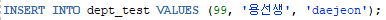 저는 위와 같이 부서번호에 99, 부서이름에 용선생, 부서지역에 대전을 입력했습니다.